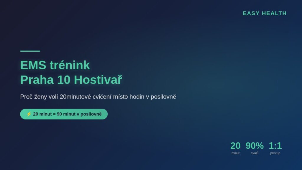 Hledáte EMS trénink v Praze 10? Studio Easy Health v Hostivaři nabízí revoluční přístup ke cvičení – pouhých 20 minut stačí k tomu, abyste dosáhly výsledků, na které byste v klasické posilovně potřebovaly hodinu a půl. Zjistěte, proč stále více žen z Prahy 10 a okolí volí právě tuto metodu.